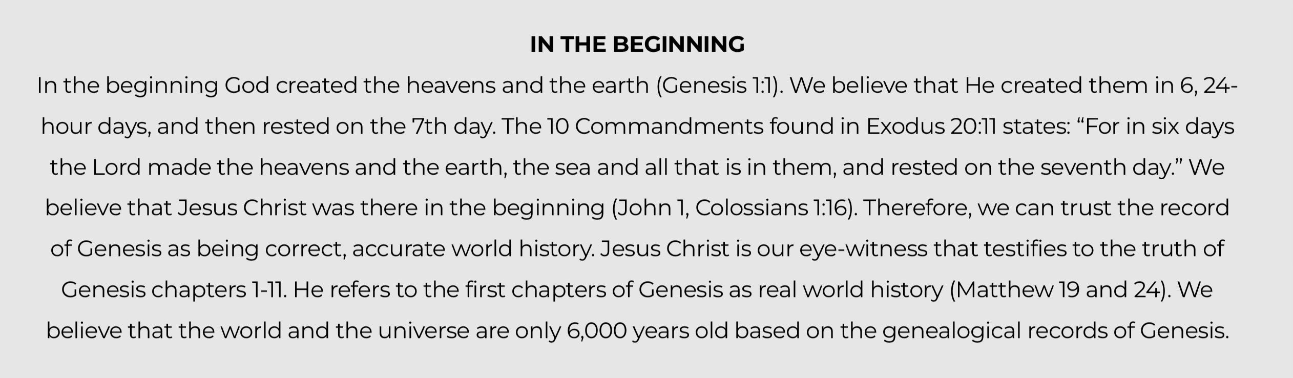 The Earth’s youngness, according to the local cult’s website, is an indisputable fact. That’s why the age of Earth is worthy of the final listing under their “What We Believe” tab. Their adherence to Young Earth and including the “6,000 years” number in their ministry’s coda (above) gives the dumb concept imprimatur legitimacy.