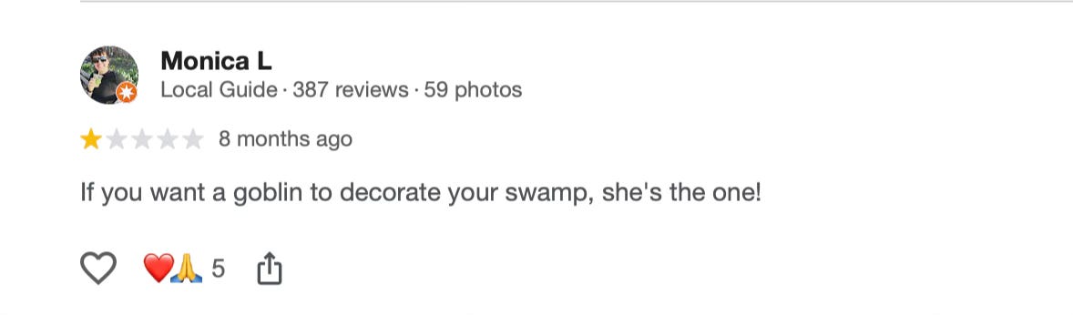 BTW, when I googled the phone number attached to “Lead Maine Action,” up came the biz page of Libby’s interior design company, which currently has a 1.5 star rating with a handful of negative reviews, apparently from people angry about her bigoted behavior and doxxing of a high school student earlier this year. I found the following review — from someone named “Monica L” — pretty amusing.