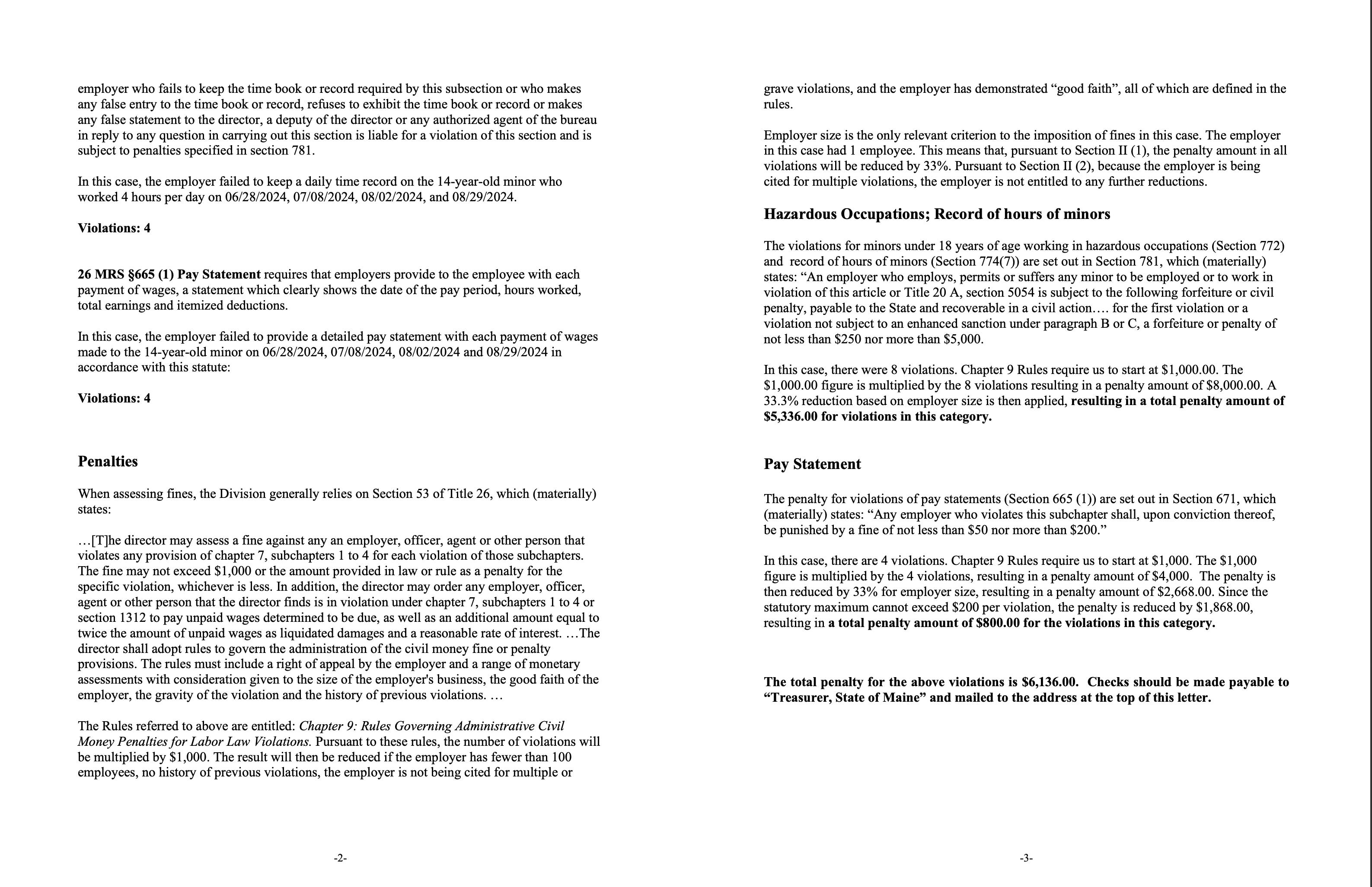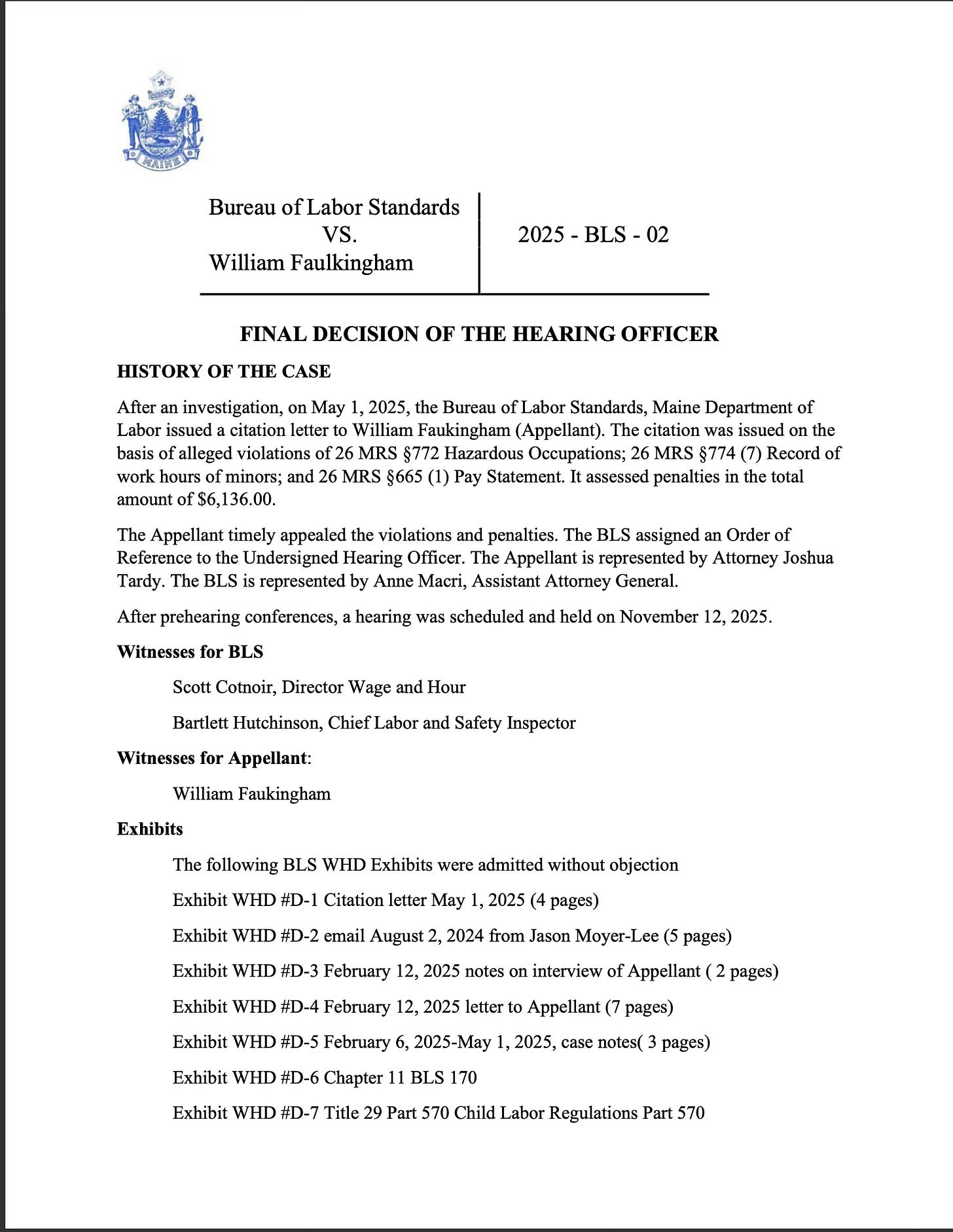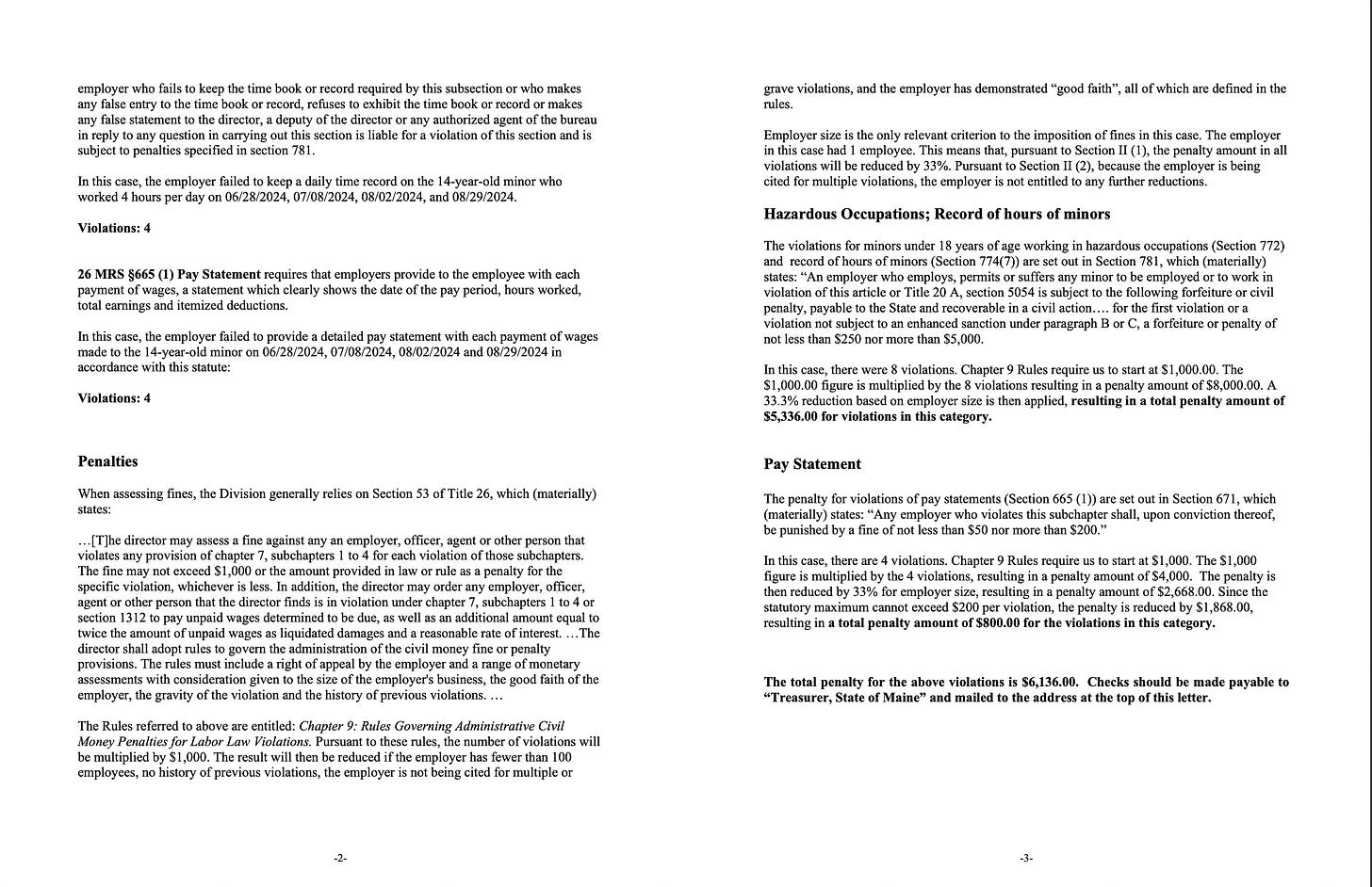 Which brings us to the DOL’s findings. You can read the letter to Faulkingham and his legal team below, but the OG ruling had four violations of 26 MRS §772 “Hazardous Occupations” rules, plus four violations of 26 MRS §774 (7) “Record of work hours of minors” and four violations of 26 MRS §665 (1), regarding “records of pay statements” by the employer.