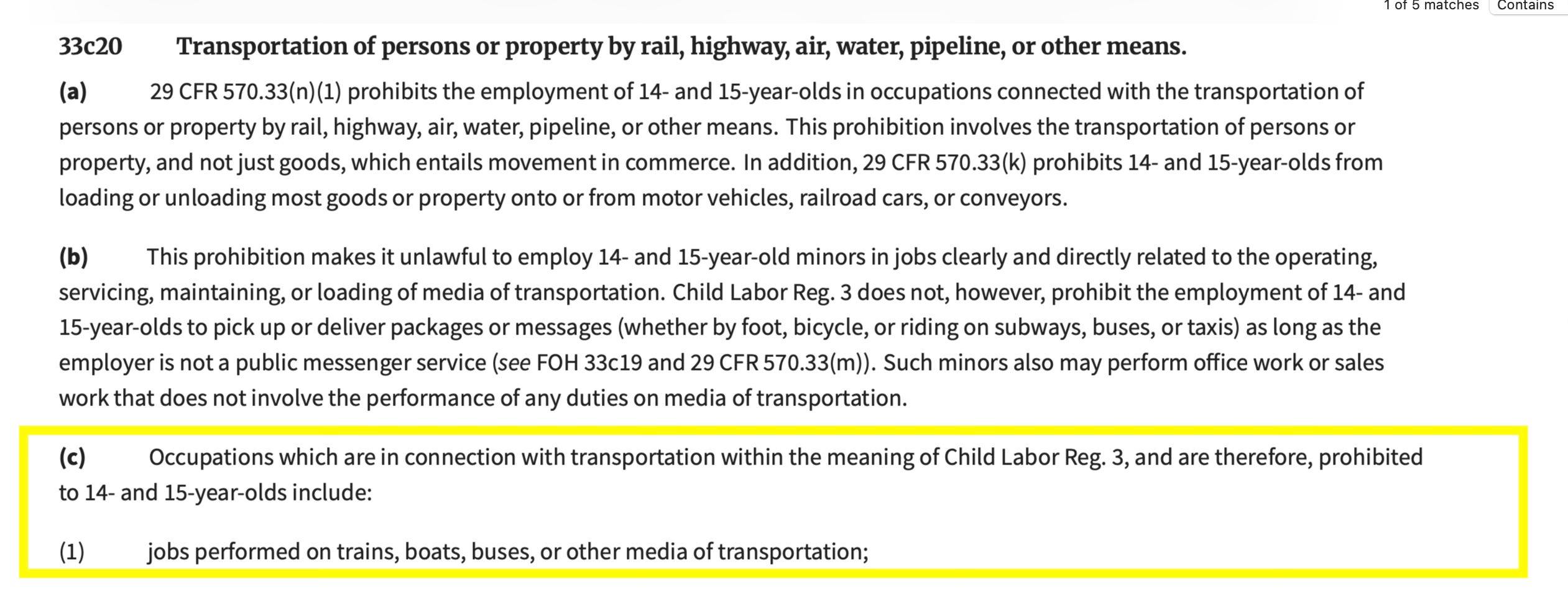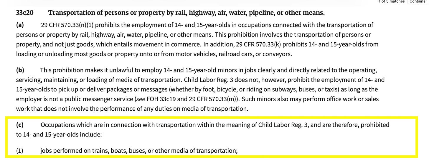 This is bullshit because federal labor law is clear and since 29 CFR 570.33(n)(1) prohibits “the employment of 14- and 15-year-olds in occupations connected with the transportation of persons or property by rail, highway, air, water, pipeline, or other means. This prohibition involves the transportation of persons or property, and not just goods, which entails movement in commerce.”