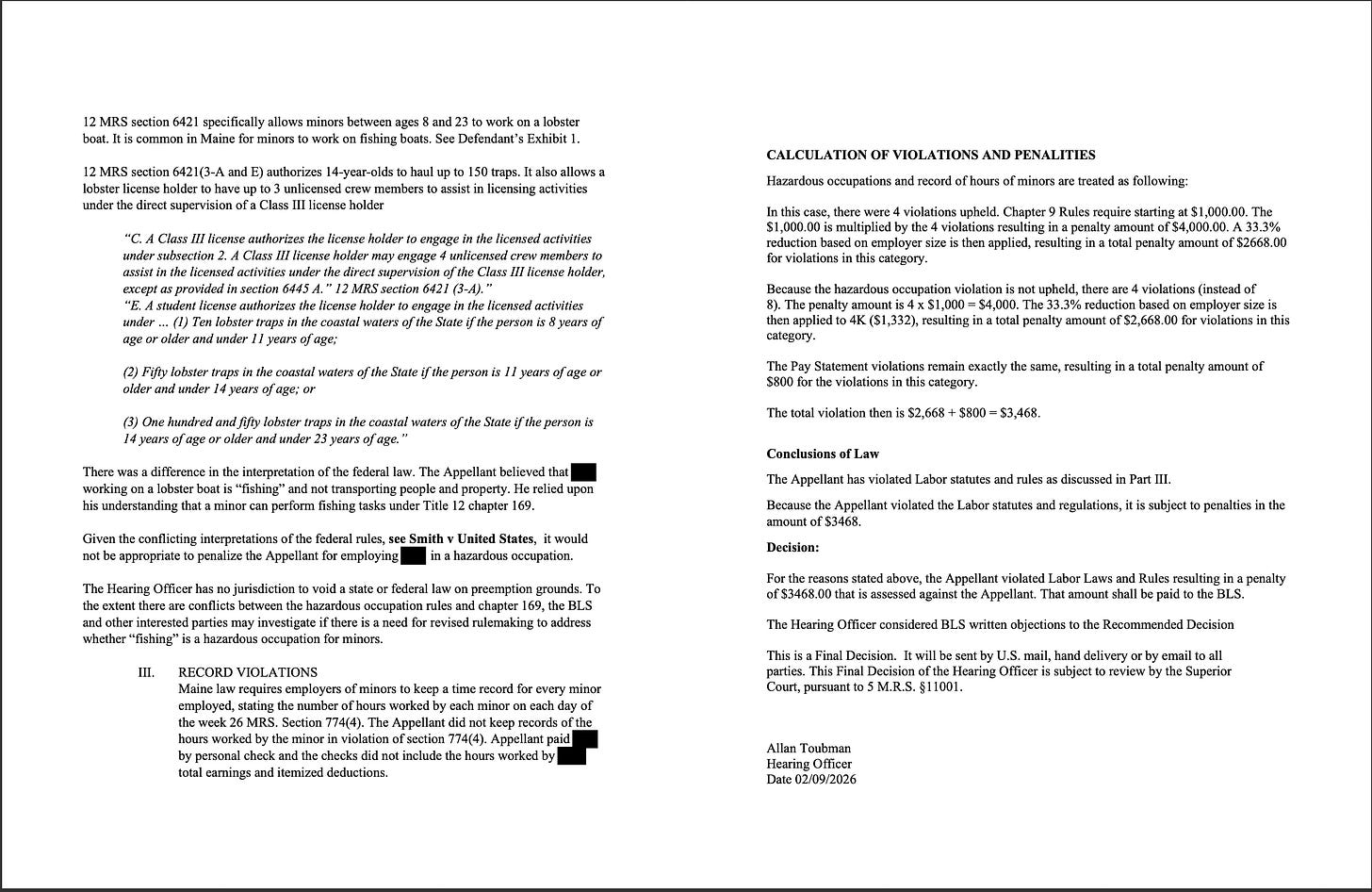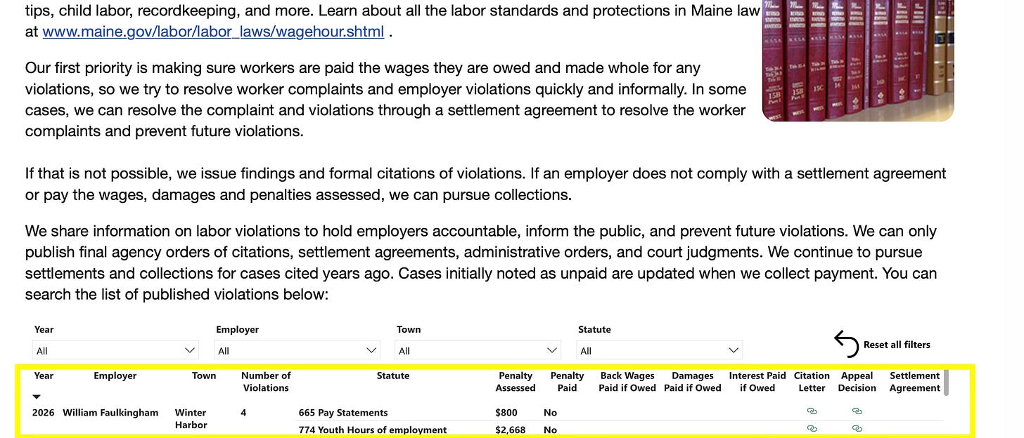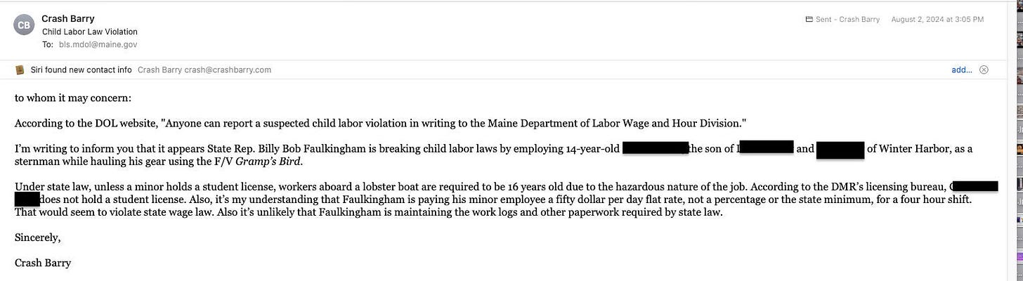 In Aug. 2024, I wrote about Billy Bob Faulkingham breaking state law by bringing a kid out to haul with him. Then I filed a complaint with Maine Dept. of Labor.
