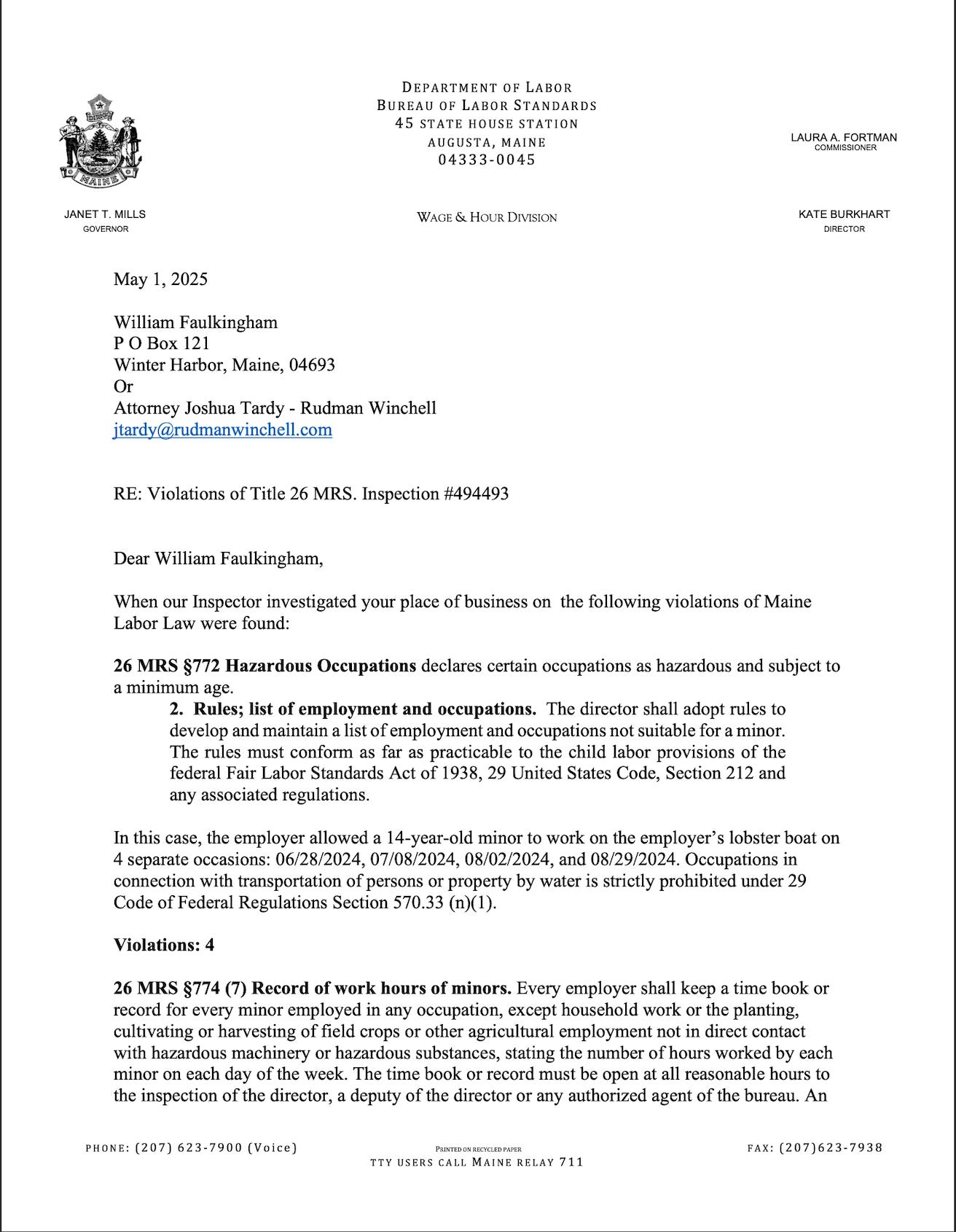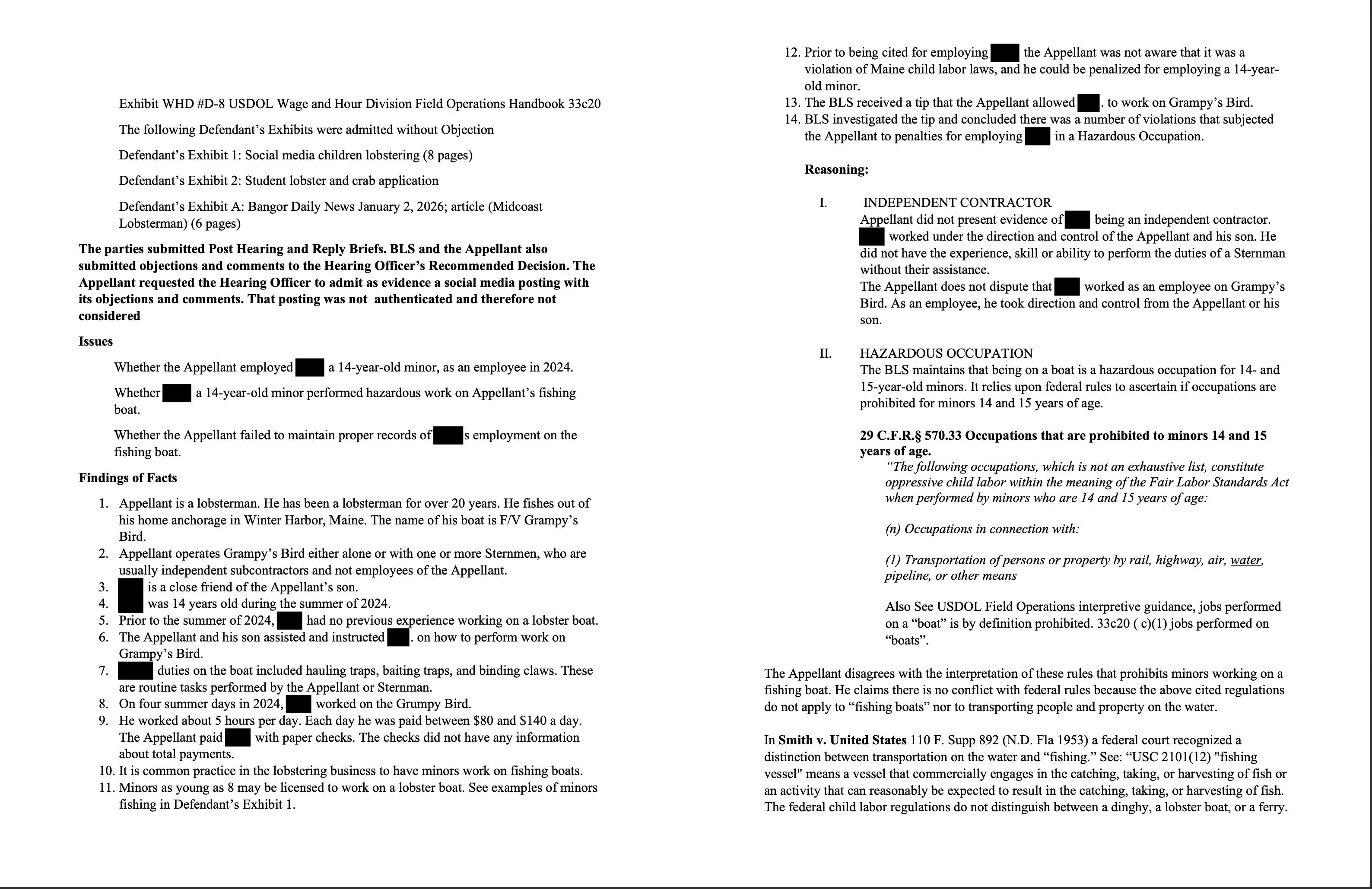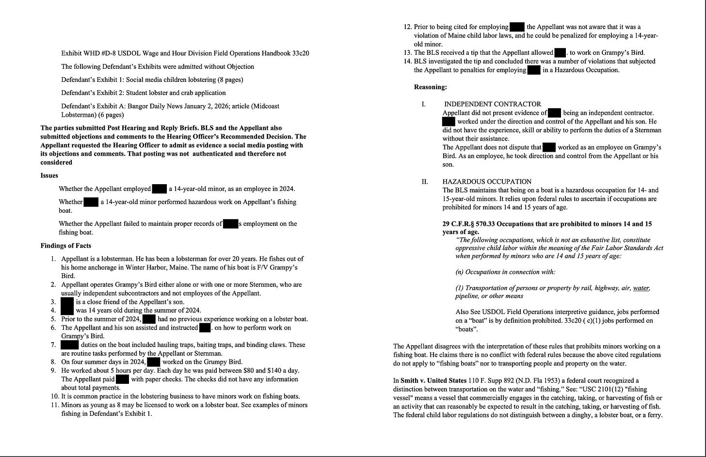 In Aug. 2024, I wrote about Billy Bob Faulkingham breaking state law by bringing a kid out to haul with him. Then I filed a complaint with Maine Dept. of Labor.