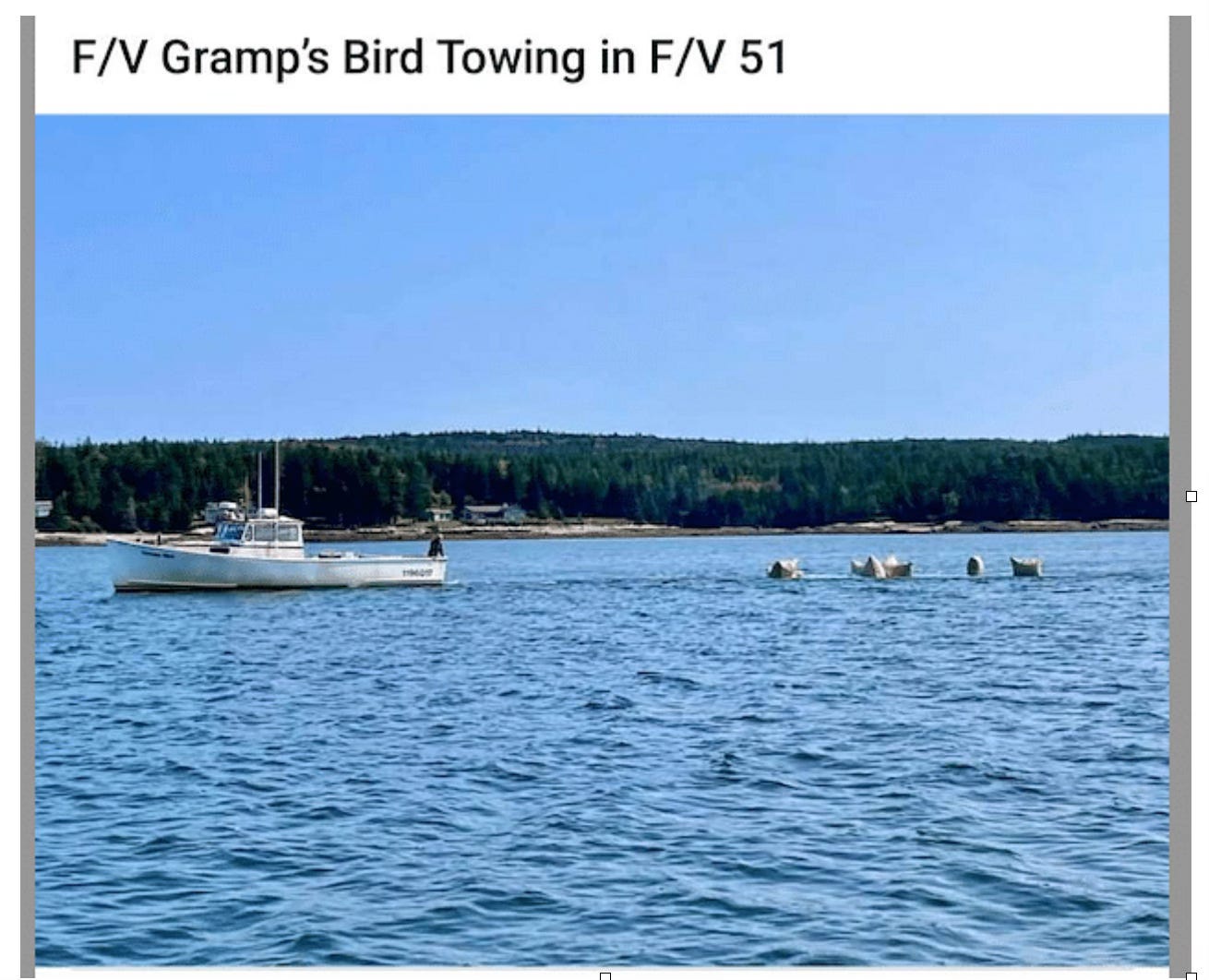 Below, btw, is a photo of the F/V Grampy’s Bird towing Faulkingham’s F/V 51 a week after the state rep claimed an angel rescued him. (The 51 is invisible because it’s being towed while submerged.)
