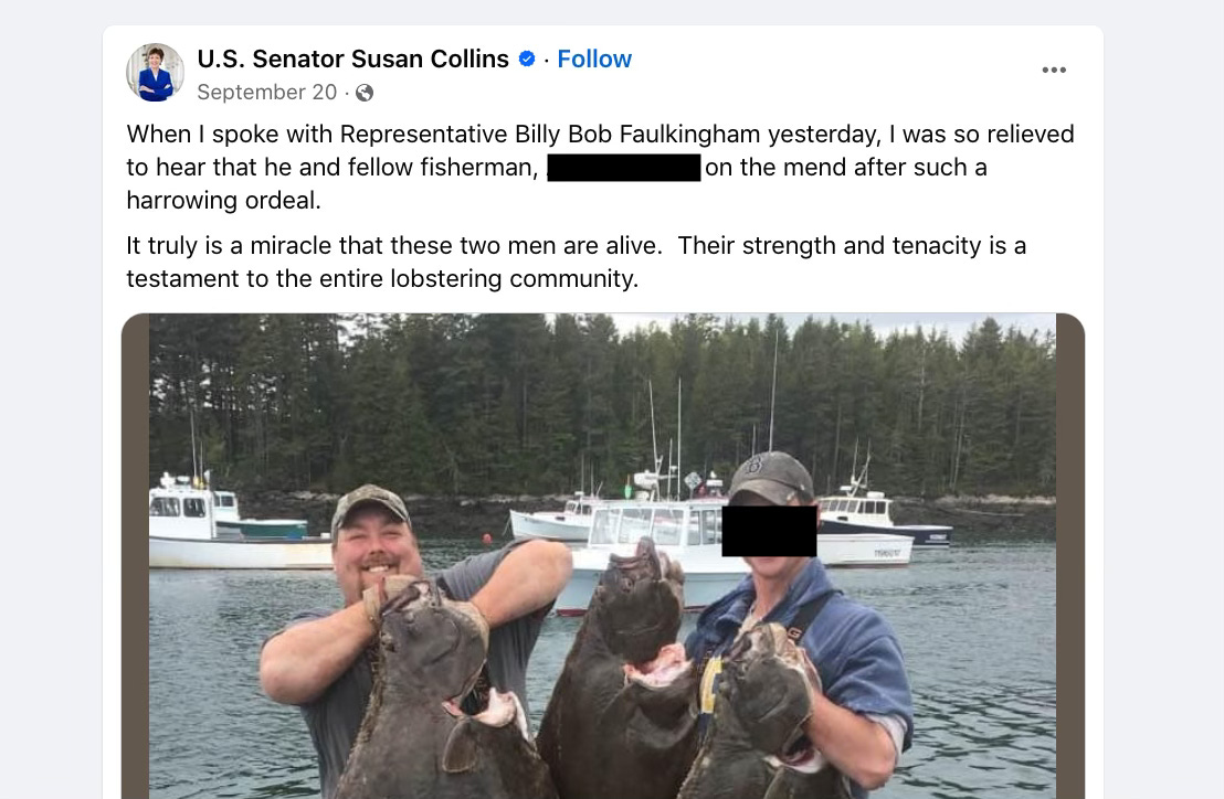 A couple summers ago, I heard chatter from down on the shore that state Rep. Billy Bob Faulkingham couldn’t find anyone to go out to haul his lobster traps with him, so he hired a neighbor’s 14-year-old kid to work as his sternman aboard a borrowed lobster boat. Which is a clear violation of child labor law. Not to mention, extremely risky, considering the last fella (the grown man pictured below) who worked for the Maine GOP House Leader was nearly killed when the state rep from Winter Harbor flipped and sank his lobster boat while filming waves breaking on Turtle Island Ledge for social media.