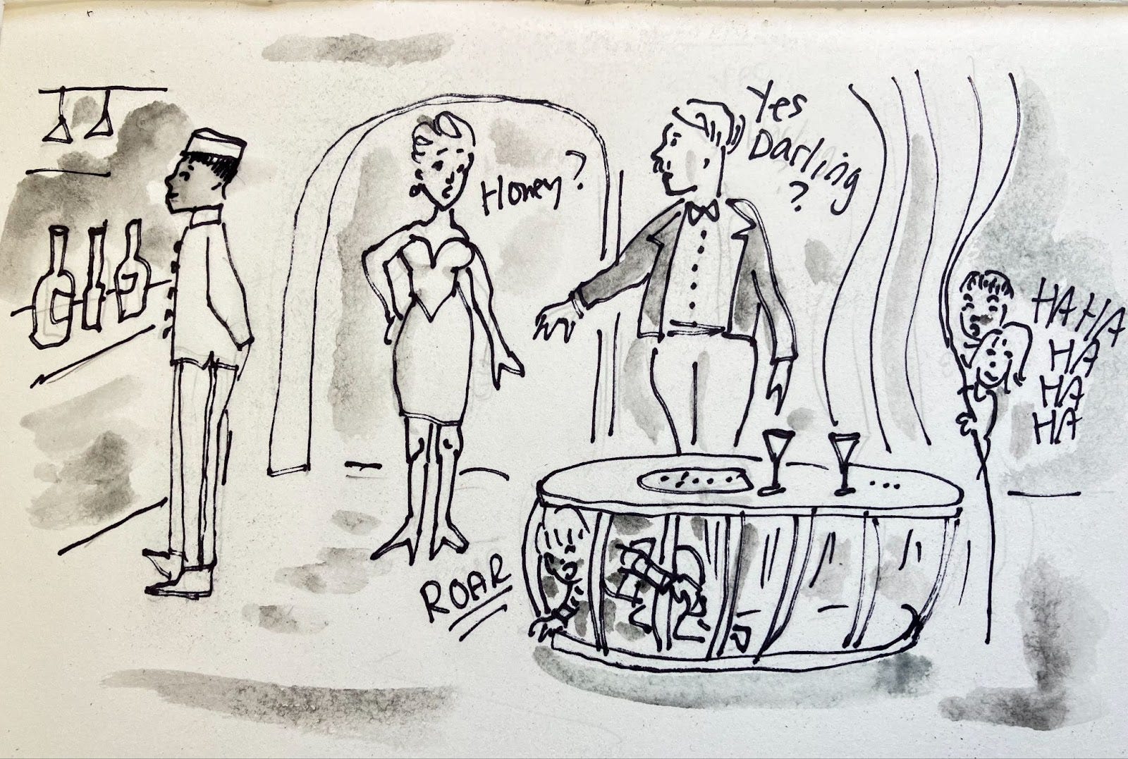 Along comes a paying customer, a fancy British couple or perhaps they are Swiss. (I am getting quite good at telling, even before people start talking.) My sister and I sneak behind a dusty velvet curtain, leaving the scary tiger in his fancy cage. It takes a moment for the couple, intent on each other and on ordering drinks, to notice Karl. He is prowling around, staring at them, occasionally extending a paw, claws out. His roar is a low murmur, almost a purr.