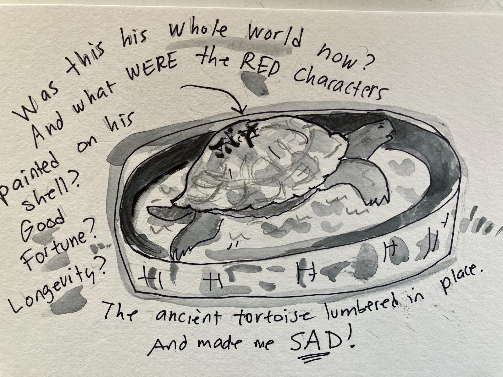 Outside, there is a tortoise. He paddles around a stinky cement pond, a red banner on his shell. He is 150 years old, someone tells me. The banner on his back says LUCKY. He does not seem that lucky to me.