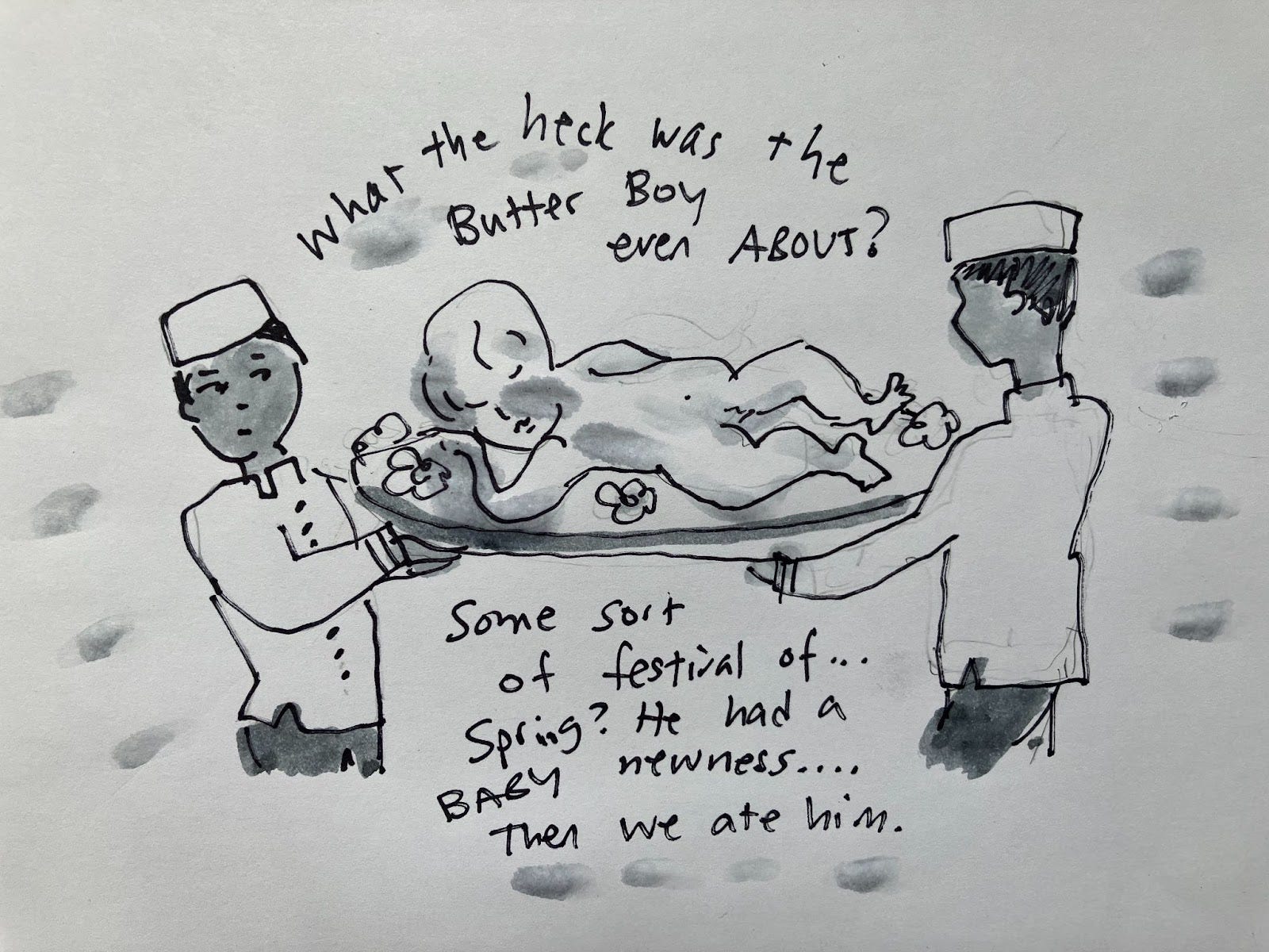 The other diners do not notice. This is because it is not Karl. It is actually a lifesize sculpture of a boy, made entirely of butter. The butter boy is leaning back amongst his bed of grapes, looking as mischievous as a putti in one of those Renaissance paintings. My mother rushes up to check on Karl. He is still asleep. She comes back.