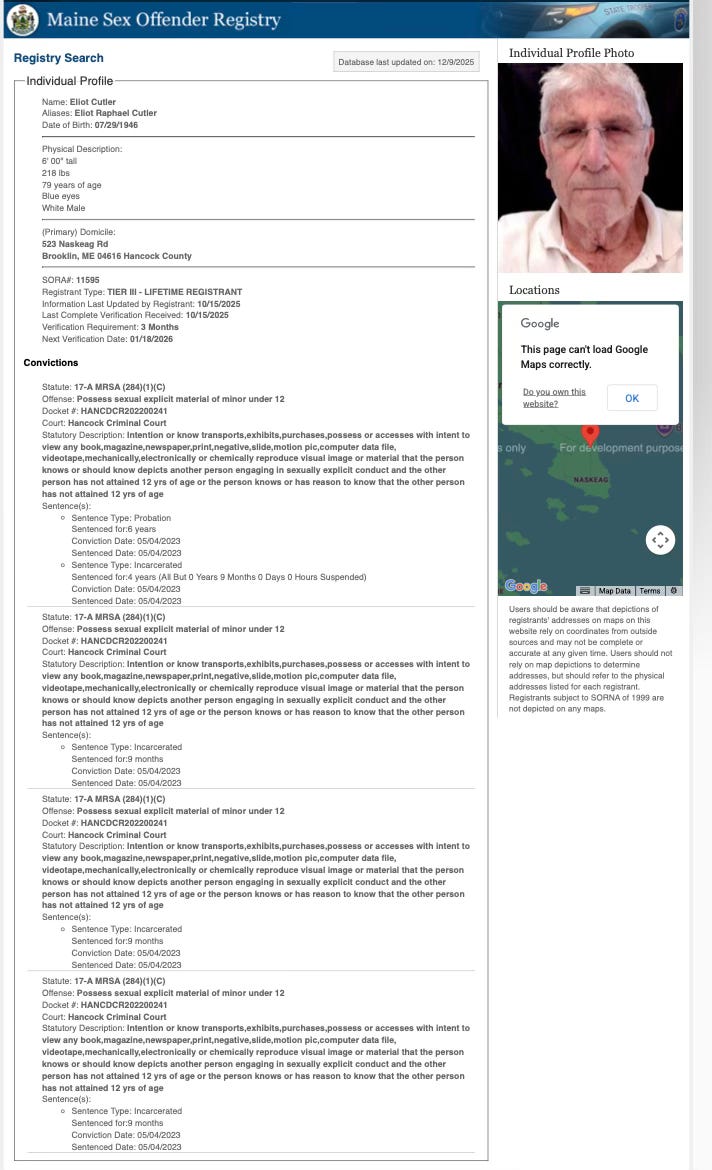Short version: His troubles in started in 2022 when cops were tipped off to Cutler’s on-line activities after he shared a 447 GB folder of illicit images (including a video of an adult male raping a four year-old girl) with some other perverts. In March of that year, Cutler was arrested at his multi-million dollar “farmhouse” in the Hancock County town of Brooklyn. At the time, his electronics were seized and cops discovered over 80,000 images of child sexual abuse material (CSAM) on his computers and drives. A year later, his legal team struck a sweet plea deal and the millionaire did a quick seven-and-a-half months in the Hancock County pokey, a fraction of his four-year sentence. And practically nuthin’, compared to other pervs busted with an equal amount of disgusting filth on their computers.