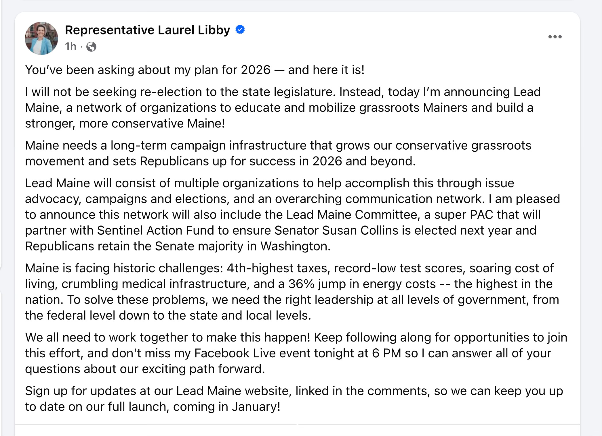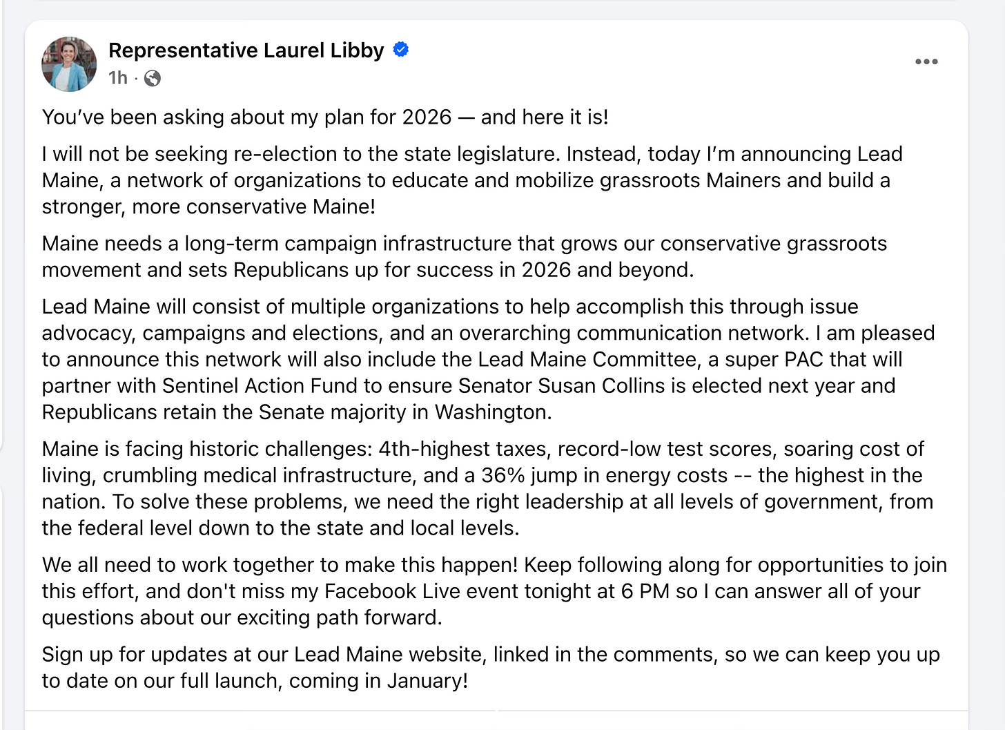 According to a press release from the Sentinel Action Fund, the federal super PAC funding the “Lead Maine Committee,” Libby will be in charge of at least four million bucks that the dark money outfit has designated to spend locally to help Collins stay in office. That’s a big leap — career-wise — from five years ago when Libby was an anti-vaxer interior designer running her first campaign for the State House. Now, she’s the boss of the newly-minted “Lead Maine Action” and “Lead Maine Committee” (the federal super PAC) and “Lead Maine” a 501(c)(4) that Libby claims will be dedicated to educating Mainers about “political and government issues that impact daily life.”
