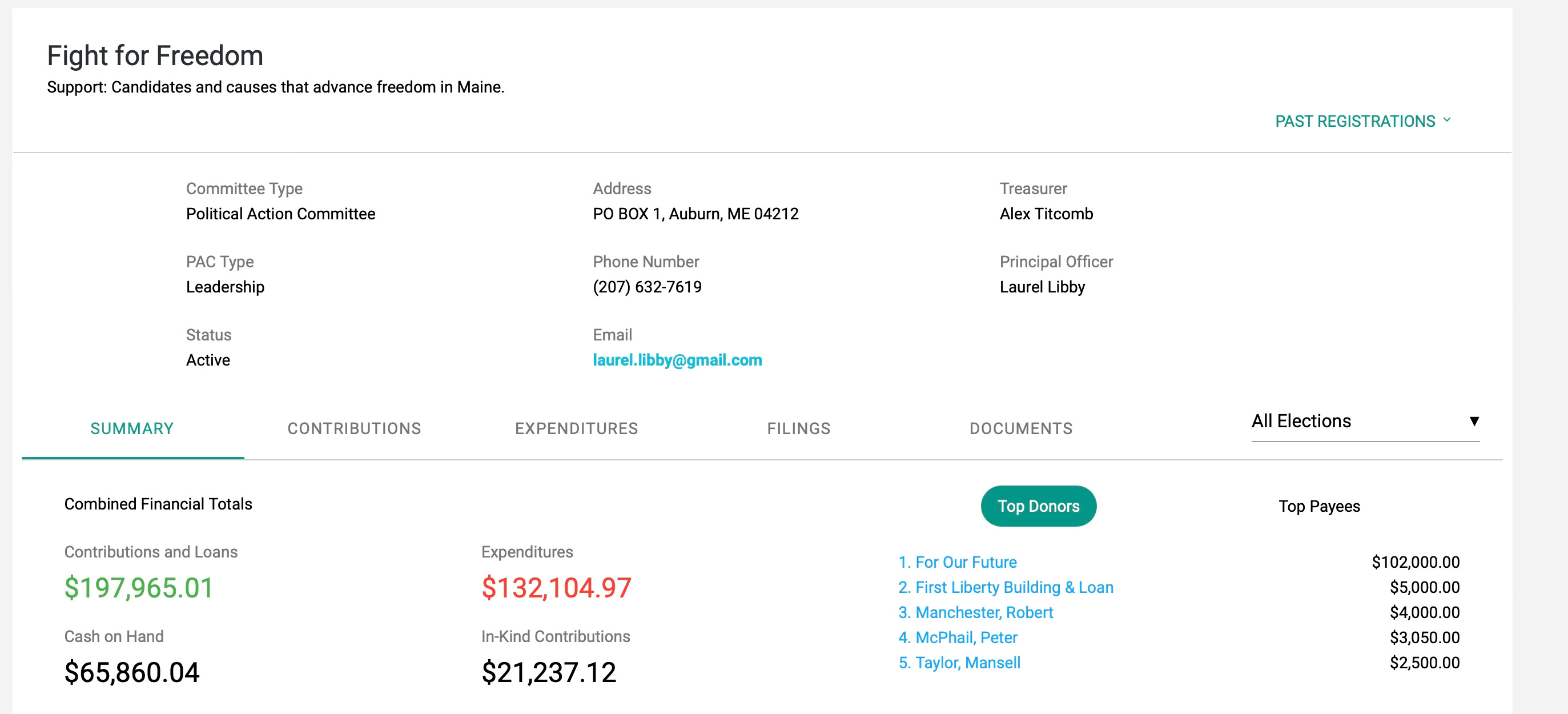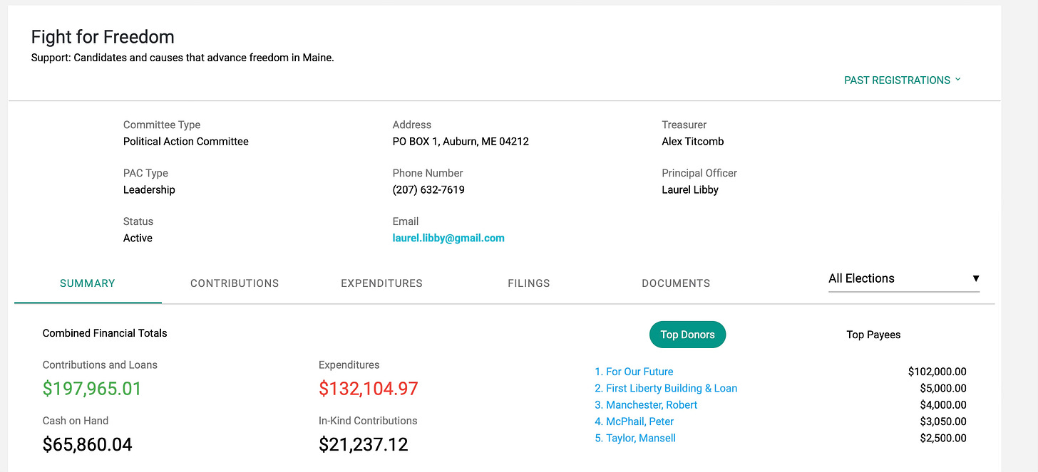 Also gotta wonder about Libby’s so-called “leadership PAC” aka “Fight For Freedom,” that currently has $65,860.04 in the bank. (A bunch of that cash coming from dark moneyman Leonard Leo via the “For Our Future” PAC run by Titcomb.) If she’s no longer serving in the Legislature, Libby will have to dissolve that PAC as well. According to state law, prior to termination, the PAC “must dispose of any surplus and report how the funds were disposed of in the final report.” Libby can “dispose” of those funds in several ways, including making contributions to other PACs, Ballot Question Committees, party committees, candidates or a non-profit. Meaning she can gift “Fight for Freedom’s” monies to either “Lead Maine” (aka her non-profit) or her “Lead Maine Action” state PAC.