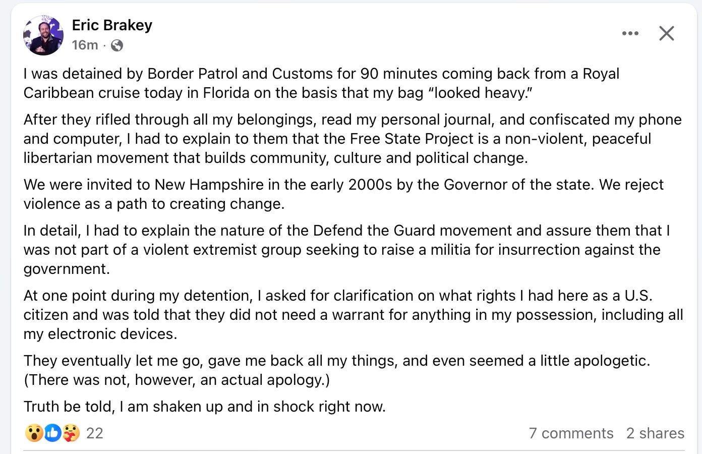 That trip, though, ended on a sour note for Brakey, who claimed he’d been detained at the Florida border for an extra 90 minutes because his bag looked “heavy” and because of his political beliefs.