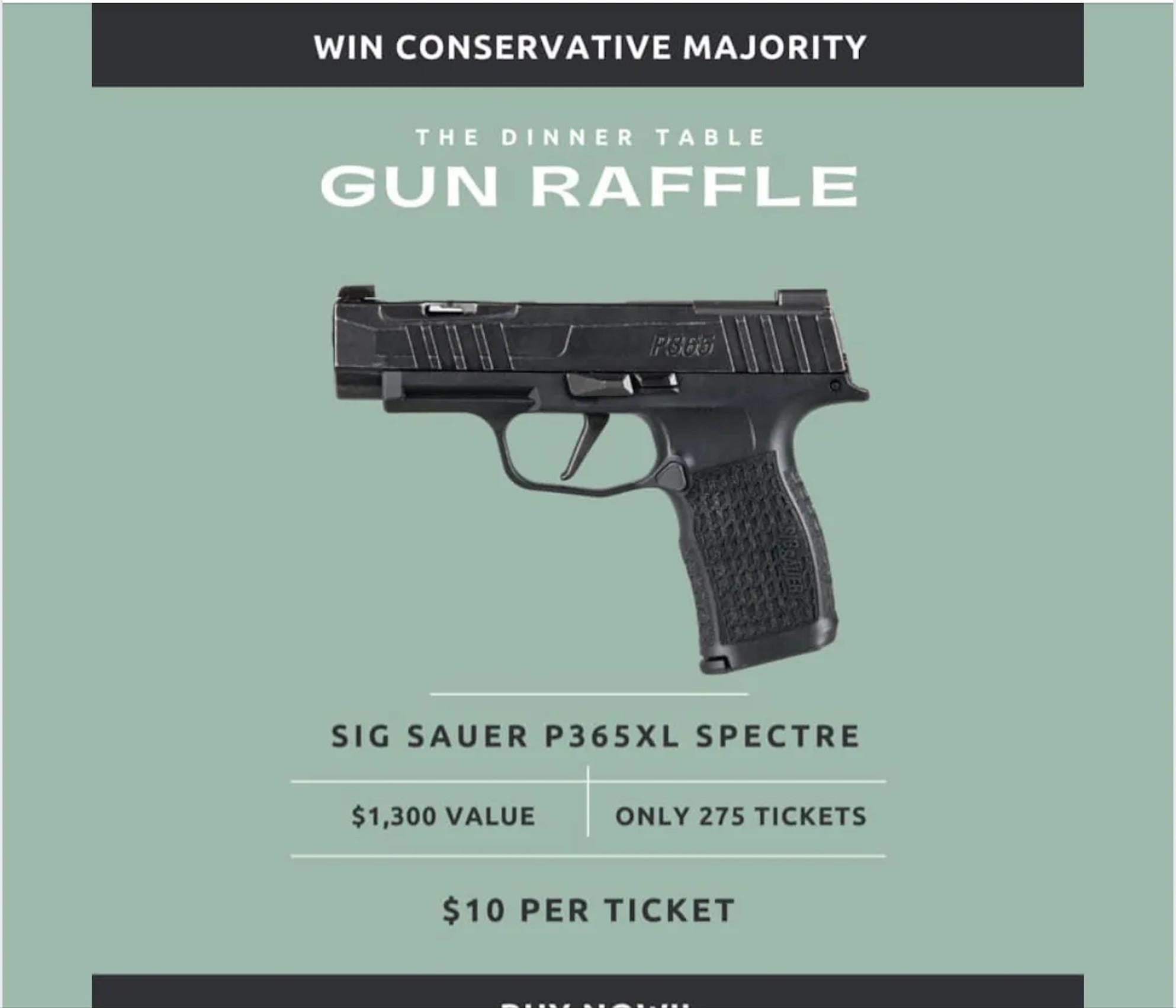 I’ve lost track of how many chud gun auctions I’ve seen, but Libby and Dinner Table definitely have done the most. In the video below, Libby is promoting the raffle of a Sig Sauer P365. No money even required for this drawing. To enter, hopefuls just had to provide their contact info to Libby’s PAC-machines. Also, this particular handgun is an interesting choice for a contest, since Sig Sauer is facing multiple lawsuits (including by a Maine cop) over the gun discharging WITHOUT the trigger being pulled.