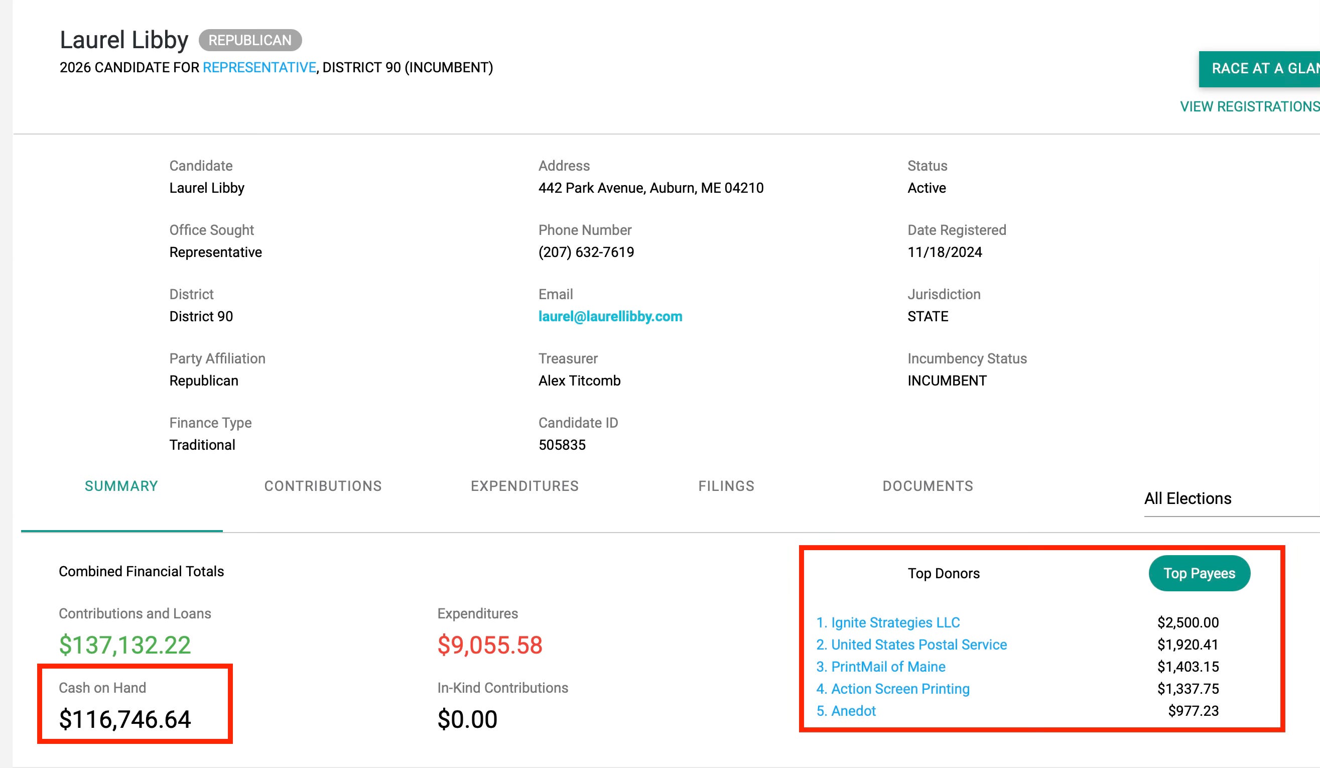 Except for Libby’s, that is. Her 2024 campaign took in $132,128, but after election day, she still had $50k in the bank. And that’s even after paying her right-hand man Titcomb, via his “Ignite Strategies, LLC” for “Personnel and campaign staff, consulting, and independent contractor costs” at the bargain basement price of $5,000.