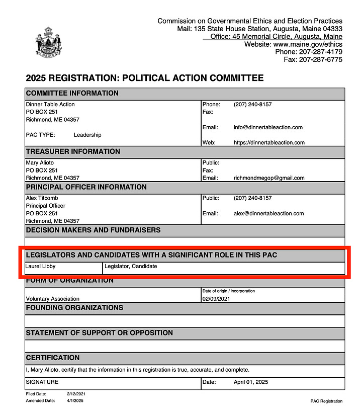 I only noticed the removal of Libby’s name, btw, because these PAC registrations are usually filed just once annually, unless a major change is made in a org. And in 2025, Dinner Table, however, filed four of ‘em.