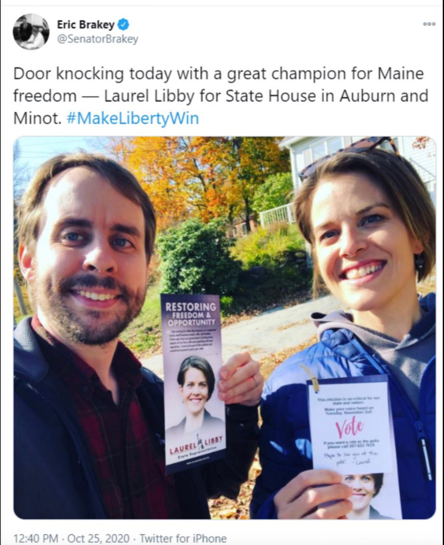 It’s fair to say that Libby owes her political success to Brakey. After all, it was Brakey who accompanied Libby on her unmasked door-knocking campaign back in the fall of 2020. Brakey — after getting his ass kicked by Angus King in the 2018 U.S. Senate and then placing third in a three-way primary for the 2020 race for CD District 2 — was on break from elected office and happy to help.