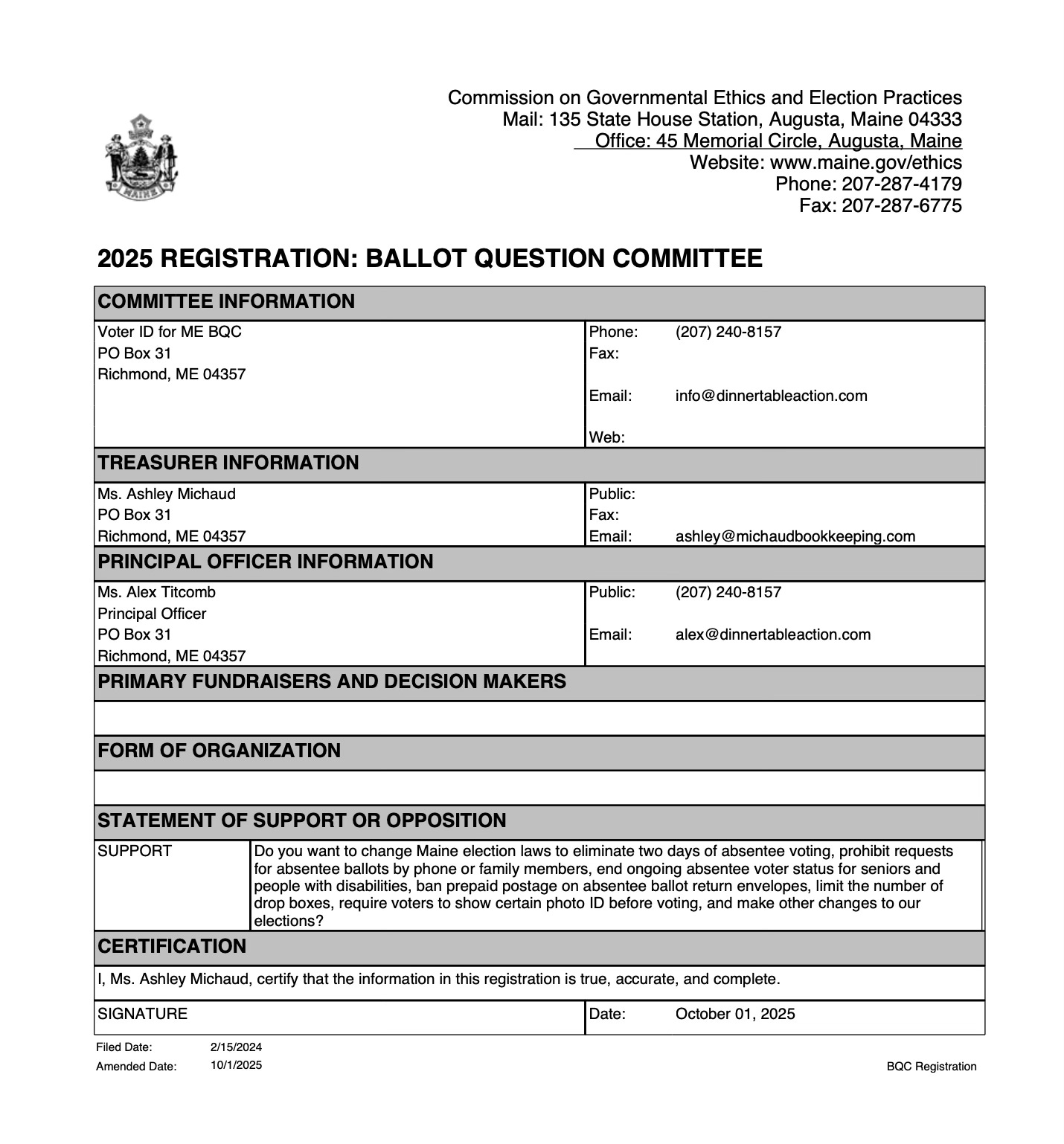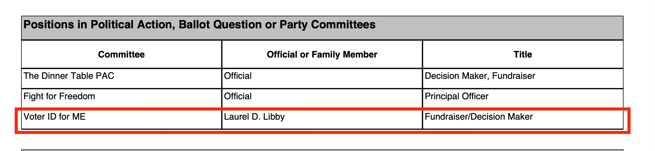 Oddly, the “Voter ID for Me” registration has Titcomb listed — repeatedly — as “Ms.” I’m assuming that’s a mistake and that’s he is a biological male. And while Libby isn’t mentioned on the “Voter ID for Me’s reg — which is considered a Ballot Question Committee, not a PAC — her 2024 financial disclosure as a lawmaker reveals she is the “fundraiser/Decision Maker” for the Voter ID BQC.