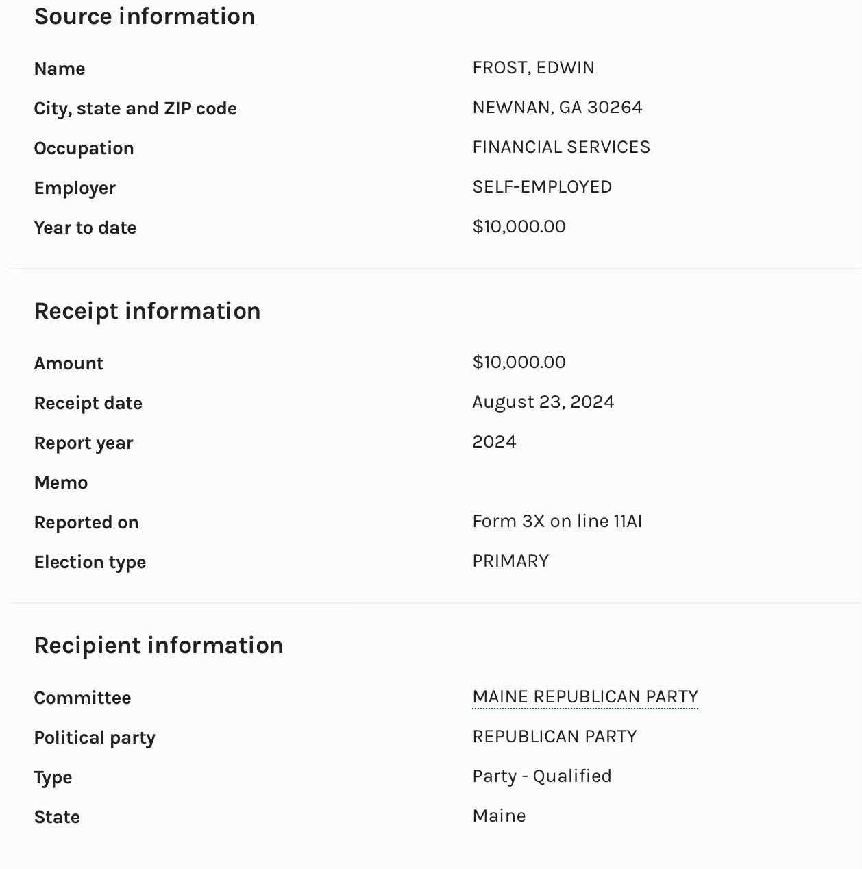 Also, according to the reporting by the Atlanta Journal-Constitution, published by the BDN, Frost also contributed $60,000 to the Maine Republican Party. However, I’ve searched the state, federal and other campaign finance databases and only found a $10k gift from the conman to the Maine Republican Party.