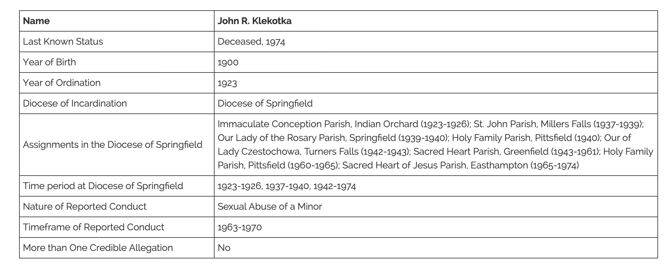 And on that list: the aforementioned Fr. John R. Klekotka, the pastor of the Sacred Heart of Jesus parish in Easthampton, Massachusetts. Church officials, however, were still hesitant to convict the now-dead priest who shuffled his mortal coil — hopefully to hell — in 1974. Fella can’t defend himself from beyond the veil, church officials argue, so his name is on the list with an asterisk of sorts.