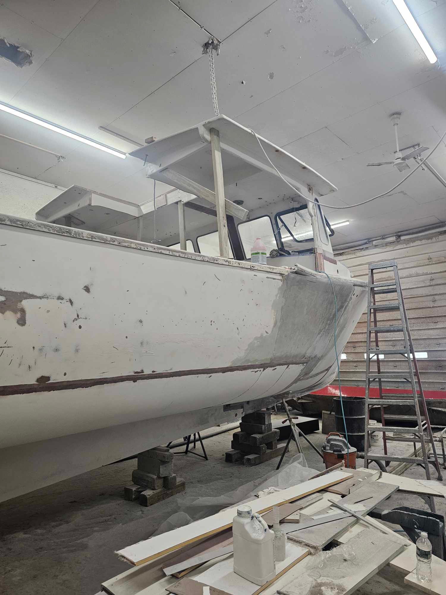 With the rest of the job on hold awaiting the engine’s arrival, the 51 is currently just taking up space in the shop. Once she’s re-powered, though, the real work can begin. Gears, propulsion and electrical. And re-building, from scratch, decks and bulkheads, from stem to stern. There’s also still some body repairs to finish, plus the inevitable odds and ends. Then she needs to be 100% re-outfitted, since everything was destroyed when she visited the ocean bottom. From new electronics to safety gear, nothing comes cheap. Not to mention the nickel-dime final costs like hauling the 51 back down to the shore for re-launching or filling her brand new and empty fuel tanks with diesel.